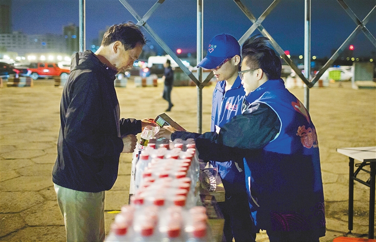 2月23日凌晨1时30分,海口港区内,海口市龙华区志愿者为滞留旅客提供面包和瓶装水。