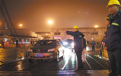 2月23日晚上10时48分,海口港16号码头,工作人员在雨中指挥滞留车辆登船过海。