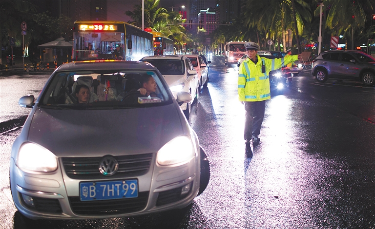 2月23日晚上10时02分,海口市滨海大道,交警为过海滞留车辆提供交通信息。