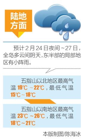 海洋方面,琼州海峡2月24日夜间~27日白天,阴天间多云有阵雨,风力5级、阵风6级。其中24日夜间到25日早晨有大雾天气,有雾时能见度差,其余时段能见度较好。