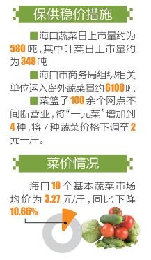 据介绍,春节前海口市农业部门积极引导农民瞄准节日期间蔬菜市场需求,合理安排节日期间消费量较大的叶菜种植时间、品种和规模。节前共种植叶菜4.06万亩,春节假期,海口蔬菜日上市量约为580吨,其中叶菜日上市量约为348吨。菜篮子产业集团加大生产种植工作力度,至2018年1月底,菜篮子蔬菜种植基地种植叶菜面积达到3010亩,春节期间稳定日产出19种叶菜约20吨,地里待采收叶菜每日保持在50吨左右,并提前采收部分叶菜存于冷库。为应对极端天气情况,海口市商务局还组织菜篮子集团、海南凤翔蔬菜批发市场、海口加旺蔬菜批发市场等单位运入岛外蔬菜量约6100吨。