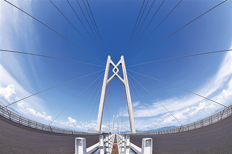 图为港珠澳大桥上的“中国结”造型桥塔。 港珠澳大桥主体工程日前完成交工验收。历经十余年的研究论证与施工建设,世界最长跨海大桥通车在即。 记者从中国铁建股份有限公司获悉,港珠澳大桥珠海连接线的核心控制性工程、世界最大断面公路隧道——拱北隧道24日全面建成。它的全面建成为港珠澳大桥正式通车奠定了基础。