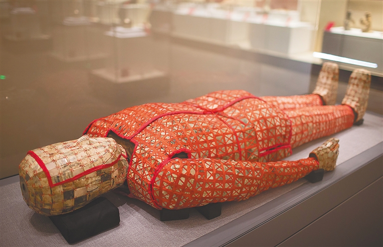 《秦汉文明展》此次展出了20余件南越王汉墓出土文物,展现了秦汉文明的多元。其中西汉南越王博物馆的镇馆之宝“丝缕玉衣”引人瞩目,用2291片玉石,以丝线穿系和麻布粘贴编缀而成的丝缕玉衣总长1.73米,是我国迄今所见年代最早、形制完备的玉衣。出土时,南越王尸体已经朽烂,玉片也散落在地,专家耗费3年多时间才将其修整复原。