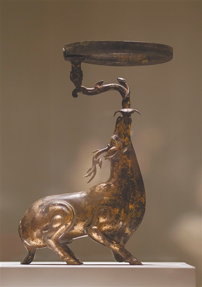 展览中,鎏金铜象和犀牛散发浓郁的东南亚风情;裂瓣纹式样的银饰,透着古代波斯或罗马文化艺术的气息;鎏金铜当卢马具,展示秦汉与北方草原文化的交流;刘汉造石狮的造型,带着古代波斯和希腊文化艺术的气息;大量宝石和玻璃器物,说明中国南方海港与南亚、东南亚等地的联系。