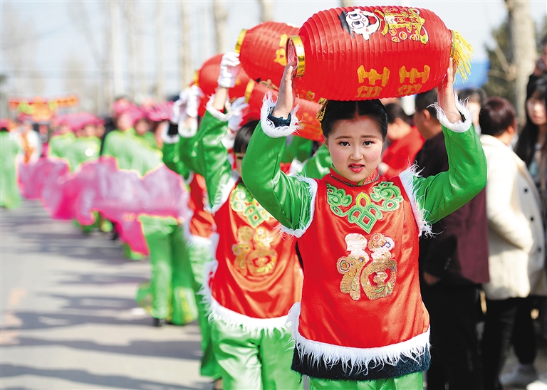 “迎城隍”在当地俗称“接爷”,已有600多年历史。迎接队伍由村民自发组成的艺术表演队组成,表演方阵围绕城隍夫妇神轿,秧歌队、舞蹈队、担子队、锣鼓队、社火队一边行进,一边演出,吸引很多观众。 新华社记者 刘潇 摄