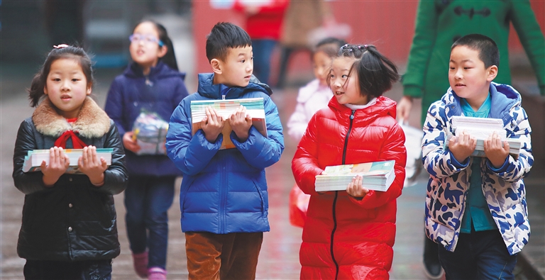 2月25日,江苏省无锡市扬名中心小学的学生们手捧刚刚领取的新课本。 近日,部分中小学校的学生开始返校报到并领取新课本,迎接开学。新华社发(汤毅 摄)