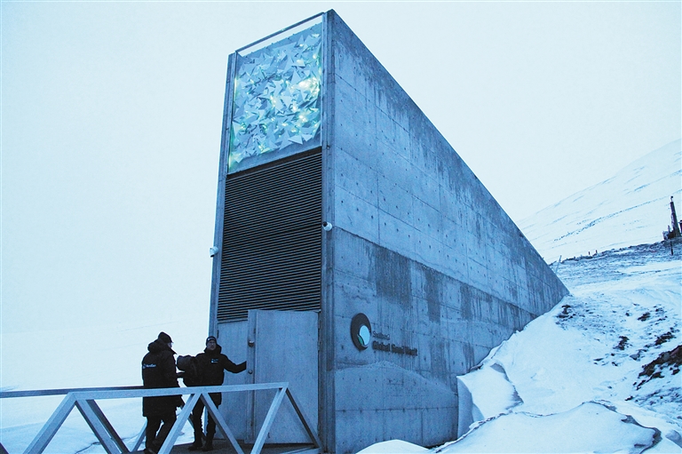 2月26日,在挪威北部斯瓦尔巴群岛,两名工作人员站在全球种子库入口。 位于挪威北部斯瓦尔巴群岛的全球种子库26日迎来启用10周年庆典。随着当天又一批种子的加入,该种子库目前储存的种子样本数已超过100万份。 新华社发