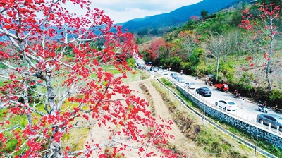 2月24日,自驾游车辆在昌江黎族自治县七叉镇宝山村的山道上排起长龙,游客们尽情观赏漫山遍野的木棉红。