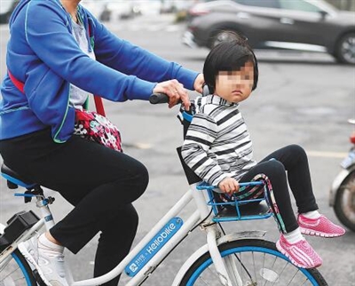 2月24日,在海口市丘海大道与滨海大道交汇处,家长骑行共享单车时直接将孩子放在车框里。这种利用共享单车当“共享摇篮”的做法,竟然在街头频频出现。 本报记者 张杰 摄