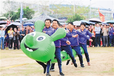 与抓鱼比赛同时进行的,是毛毛虫接力比赛,15名运动员被分成3组,骑着形似毛毛虫的气球进行接力比赛“一定要听口令,喊‘一’迈左脚,‘二’迈右脚。”还未上场比赛,军普村的黎亚正就先当起了“军师”。