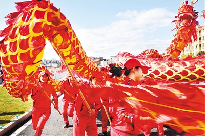 2月28日,在江西省靖安县香田乡白露村,民俗表演队在表演舞龙。 元宵节将至,各地举行丰富多彩的民俗活动迎接佳节的到来。 新华社发(徐仲庭 摄)