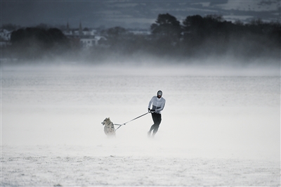 2月28日,在爱尔兰首都都柏林的凤凰公园,一名男子和宠物狗在雪地里奔跑。 当日,一场暴风雪袭击了爱尔兰大部分地区。据当地气象台报道,这是自1982年以来爱尔兰遭遇的最严重的暴风雪。 新华社/路透