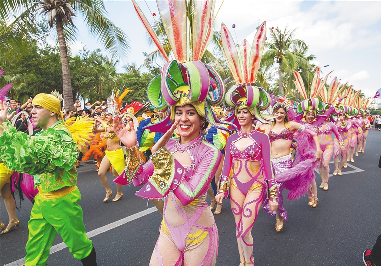 上午9时许,巡游花车9大方阵启动了三亚国际音乐节。9大方阵包括鼓花车方阵、黎族歌舞秀方阵、象征海洋气息的章鱼方阵、南美风情舞蹈方阵、机车方阵等,容纳民族、海洋、电音、国际等流行元素,不同风格的表演,传递出年轻、多元的文化气息,也吸引了大量人群注目欣赏。