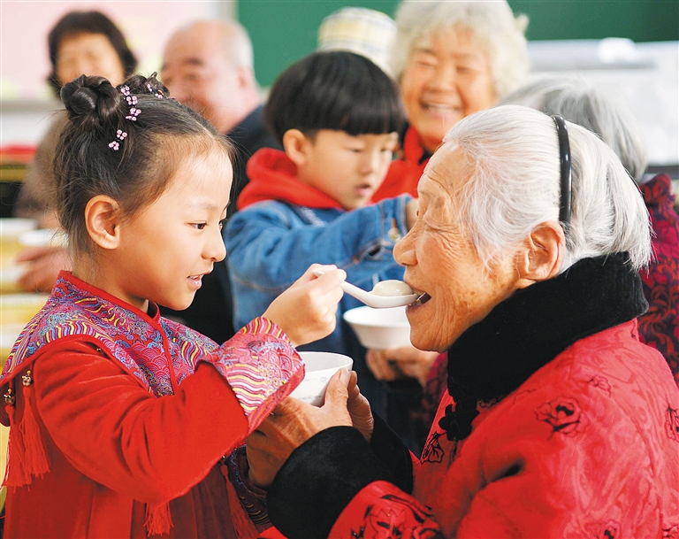 3月1日,在河北省石家庄市海天阳光园社区举行的欢庆元宵节活动中,6岁的康铭轩小朋友请李梅顺老奶奶品尝元宵。 新华社发