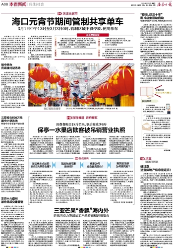 海南日报 本省新闻民生/社会 008 2018-03-021 2018年03月02日 星期五