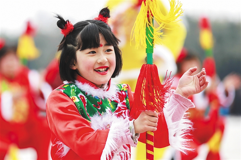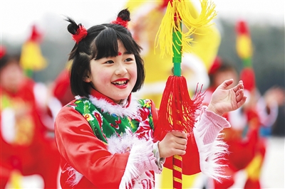 江苏省盱眙县的一名小朋友在元宵节表演钱杆舞。 新华社发