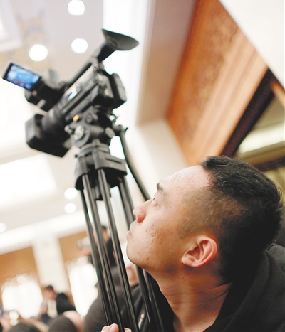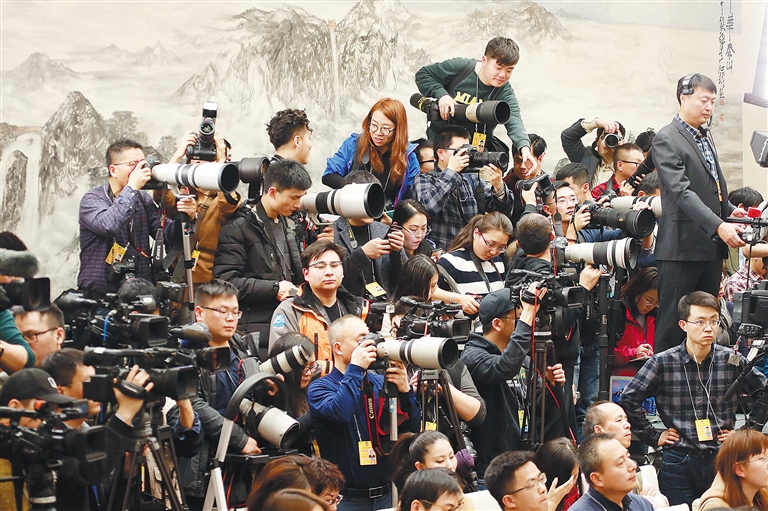 3月2日下午,全国政协十三届一次会议在人民大会堂召开新闻发布会。图①、图②为参加新闻发布会的媒体记者使出浑身解数,第一时间认真报道大会盛况。