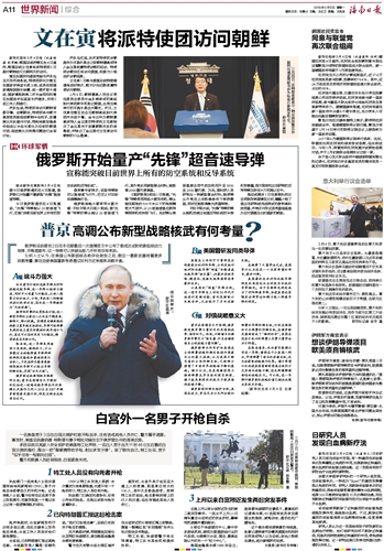 俄总统普京1日在莫斯科向议会两院发表国情咨文时,着重介绍了俄正在研制或完成测试的数种高科技武器,并表示开发这类武器装备是为应对美国及北约国家的威胁。