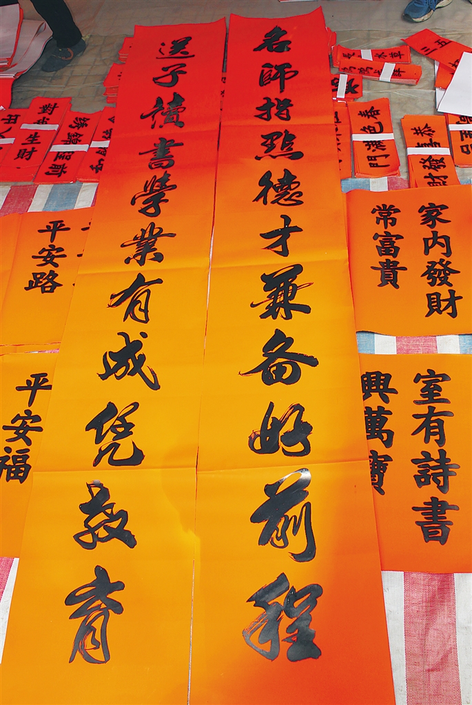记者采访他时,符国干正在为客户书写一副婚联:“九畹兰香花并蒂,千秋桐绿凤双飞。”用加丹纸写的这副对联,醒目、充满喜气。
