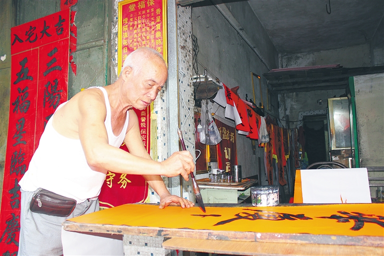 在儋州市那大镇东门街,符国干开了一个门店,除了从事雕刻,还代写对联。他说,从中和镇出来,到那大镇经营这个门店已有25年,绝大部分对联都是写在加丹纸上。
