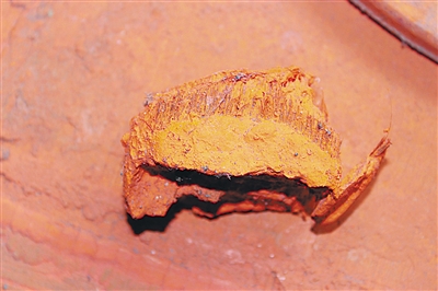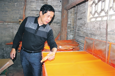 李郁成介绍,加丹纸的制作流程为“四步走”:把红丹打磨成粉,剔出杂质;将红丹粉放在大锅里煮,并加入其他原料进行配方;将煮稠的红丹浆涂抹在较厚的白纸上;让涂抹了红丹浆的纸自然风干。