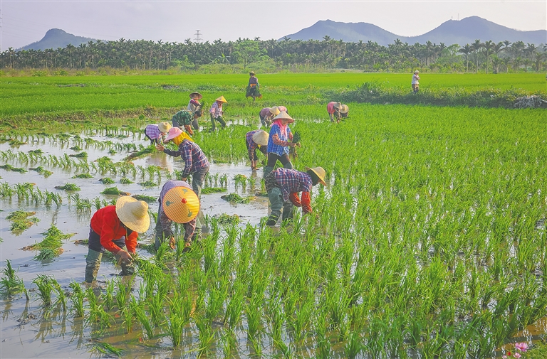 3月4日,琼海博鳌,农户正抓紧有利天气在稻田里忙插秧,播种下新一年的新希望。