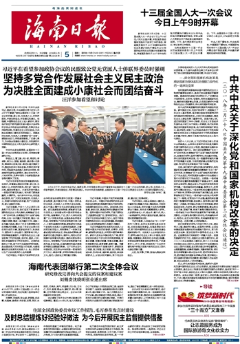 | 海南日报 头版 001 2018-03-051 2018年03月05日 星期一 |