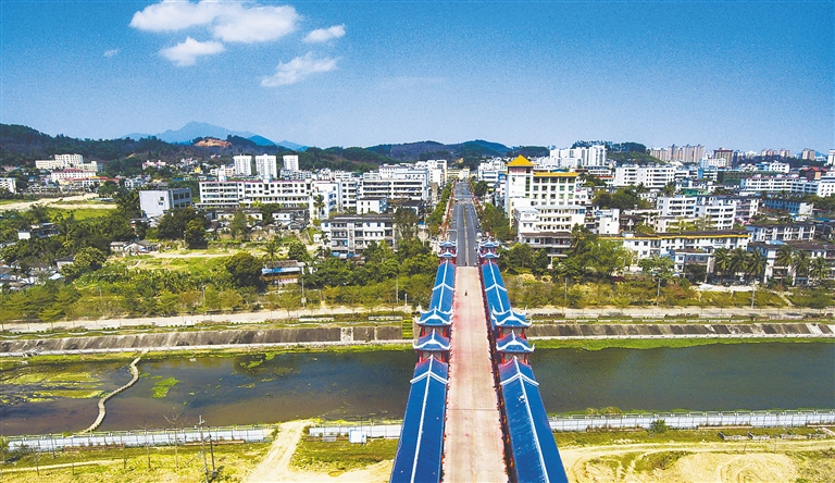 临街建筑整齐划一,商铺、酒店、宾馆的墙体被抹上了“彩妆”。船型屋、甘工鸟、大力神等民族图腾分布在各式建筑上,黎苗风情浓郁。宽阔平坦的道路两旁,火焰木、紫荆树、三角梅鲜花绽放,形成一道亮丽的风景线。