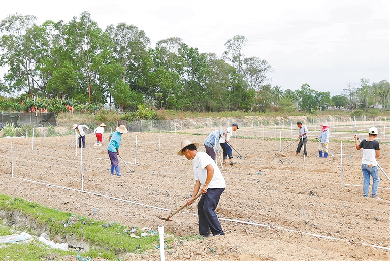 3月7日上午,初春的太阳暖洋洋。在陵水黎族自治县文罗镇坡村的一处菜园,十几名农民正趁着好天气耕地、除草,为播种新一轮蔬菜做准备。