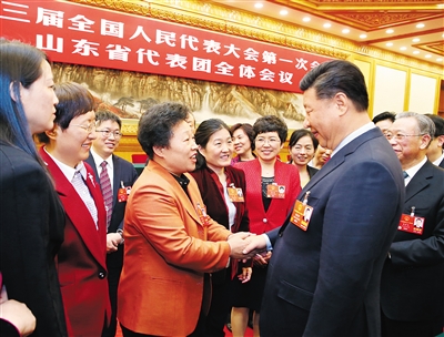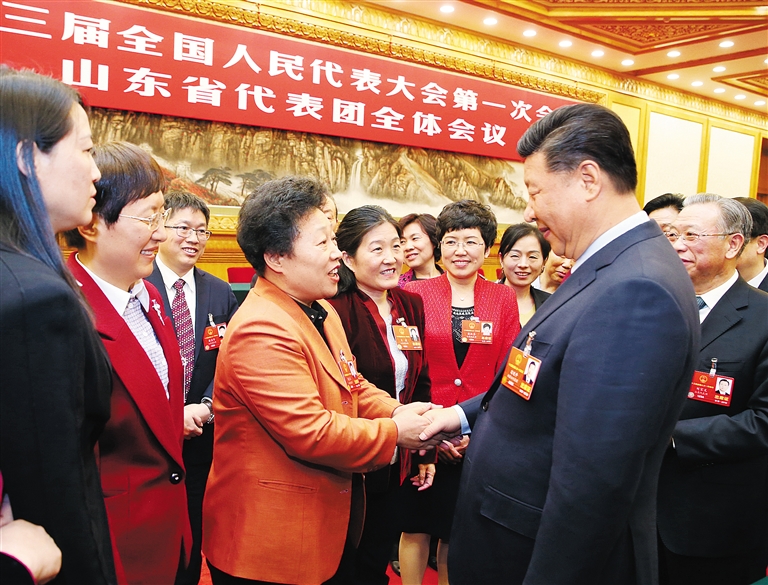 习近平在山东代表团参加审议。会上,刘家义、龚正、谭旭光、邱亚夫、卓长立、王银香、傅明先、张淑琴等8位代表先后围绕加快新旧动能转换、科技创新赢得时尚话语权、解决好“两难”人员就业等问题发表意见。当龚正谈到推动高质量发展要有功成不必在我的思想时,习近平强调,功成不必在我并不是消极、怠政、不作为,而是要牢固树立正确政绩观,既要做让老百姓看得见、摸得着、得实惠的实事,也要做为后人作铺垫、打基础、利长远的好事,既要做显功,也要做潜功,不计较个人功名,追求人民群众的好口碑、历史沉淀之后真正的评价。接着张淑琴谈到的让红色基因注入血脉代代相传的话题,习近平强调,红色基因就是要传承。中华民族从站起来、富起来到强起来,经历了多少坎坷,创造了多少奇迹,要让后代牢记,我们要不忘初心,永远不可迷失了方向和道路。习近平在最后的重要讲话中充分肯定党的十八大以来山东工作,希望山东的同志再接再厉,在全面建成小康社会进程中、在社会主义现代化建设新征程中走在前列,全面开创新时代现代化强省建设新局面。习近平指出,实施乡村振兴战略,是党的十九大作出的重大决策部署,是决胜全面建成小康社会、全面建设社会主义现代化国家的重大历史任务,是新时代做好“三农”工作的总抓手。农业强不强、农村美不美、农民富不富,决定着全面小康社会的成色和社会主义现代化的质量。要深刻认识实施乡村振兴战略的重要性和必要性,扎扎实实把乡村振兴战略实施好。习近平强调,实施乡村振兴战略是一篇大文章,要统筹谋划,科学推进。要推动乡村产业振兴,紧紧围绕发展现代农业,围绕农村一二三产业融合发展,构建乡村产业体系,实现产业兴旺,把产业发展落到促进农民增收上来,全力以赴消除农村贫困,推动乡村生活富裕。要发展现代农业,确保国家粮食安全,调整优化农业结构,加快构建现代农业产业体系、生产体系、经营体系,推进农业由增产导向转向提质导向,提高农业创新力、竞争力、全要素生产率,提高农业质量、效益、整体素质。要推动乡村人才振兴,把人力资本开发放在首要位置,强化乡村振兴人才支撑,加快培育新型农业经营主体,让愿意留在乡村、建设家乡的人留得安心,让愿意上山下乡、回报乡村的人更有信心,激励各类人才在农村广阔天地大施所能、大展才华、大显身手,打造一支强大的乡村振兴人才队伍,在乡村形成人才、土地、资金、产业汇聚的良性循环。要推动乡村文化振兴,加强农村思想道德建设和公共文化建设,以社会主义核心价值观为引领,深入挖掘优秀传统农耕文化蕴含的思想观念、人文精神、道德规范,培育挖掘乡土文化人才,弘扬主旋律和社会正气,培育文明乡风、良好家风、淳朴民风,改善农民精神风貌,提高乡村社会文明程度,焕发乡村文明新气象。要推动乡村生态振兴,坚持绿色发展,加强农村突出环境问题综合治理,扎实实施农村人居环境整治三年行动计划,推进农村“厕所革命”,完善农村生活设施,打造农民安居乐业的美丽家园,让良好生态成为乡村振兴支撑点。要推动乡村组织振兴,打造千千万万个坚强的农村基层党组织,培养千千万万名优秀的农村基层党组织书记,深化村民自治实践,发展农民合作经济组织,建立健全党委领导、政府负责、社会协同、公众参与、法治保障的现代乡村社会治理体制,确保乡村社会充满活力、安定有序。要推动乡村振兴健康有序进行,规划先行、精准施策、分类推进,科学把握各地差异和特点,注重地域特色,体现乡土风情,特别要保护好传统村落、民族村寨、传统建筑,不搞一刀切,不搞统一模式,不搞层层加码,杜绝“形象工程”。习近平强调,要充分尊重广大农民意愿,调动广大农民积极性、主动性、创造性,把广大农民对美好生活的向往化为推动乡村振兴的动力,把维护广大农民根本利益、促进广大农民共同富裕作为出发点和落脚点。习近平强调,海洋是高质量发展战略要地。要加快建设世界一流的海洋港口、完善的现代海洋产业体系、绿色可持续的海洋生态环境,为海洋强国建设作出贡献。