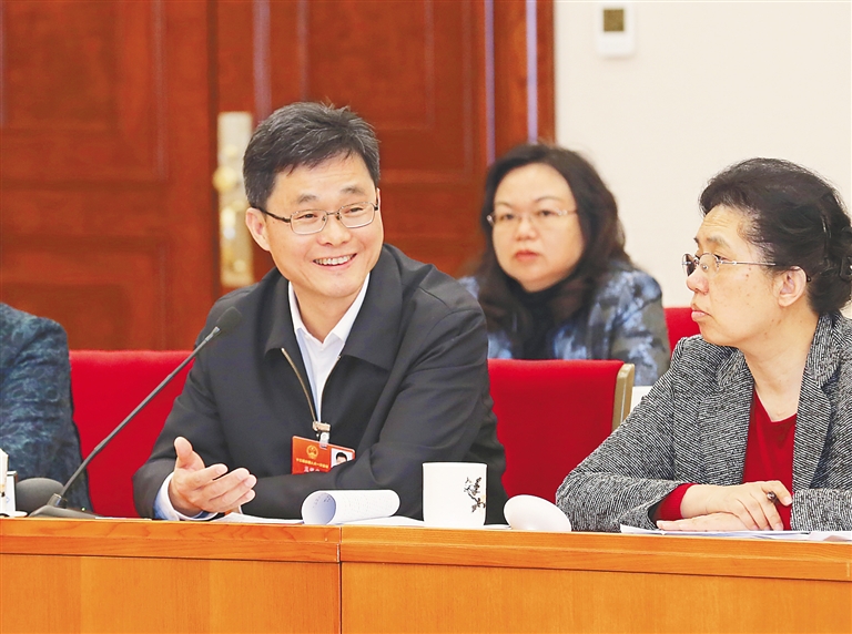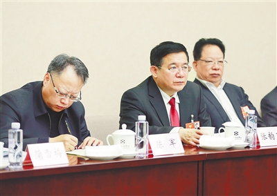 3月8日,参加十三届全国人大一次会议的海南代表团举行全体会议,审查计划报告和预算报告。图为蓝佛安代表(左一)在发言。本报特派记者 李英挺 摄