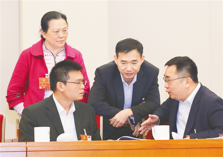 3月8日,参加十三届全国人大一次会议的海南代表团举行全体会议,审查计划报告和预算报告。图为会议休息时间,代表们在热烈交流。本报特派记者 李英挺 摄