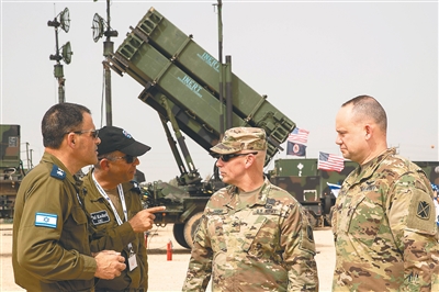 3月8日,在以色列哈措尔空军基地,美国和以色列军官在“杜松眼镜蛇2018”联合反导军演上交谈。