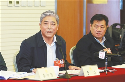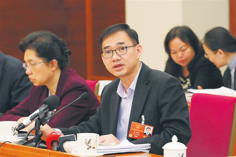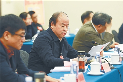 3月10日,参加十三届全国人大一次会议的海南代表团在驻地举行全体会议,审议两高工作报告。图为朱洪武代表(前右)发言。 本报特派记者 李英挺 摄