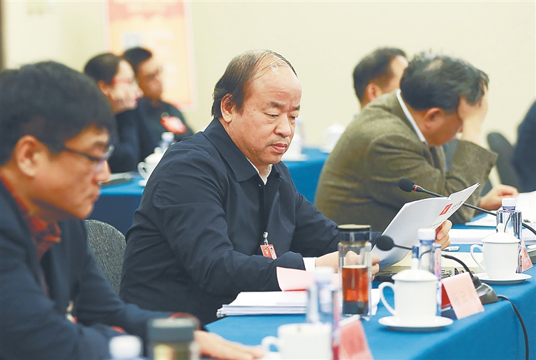 3月7日,全国政协十三届一次会议进行小组会议。图为住琼全国政协委员康耀红(中)参加小组会议。 本报特派记者 张杰 摄