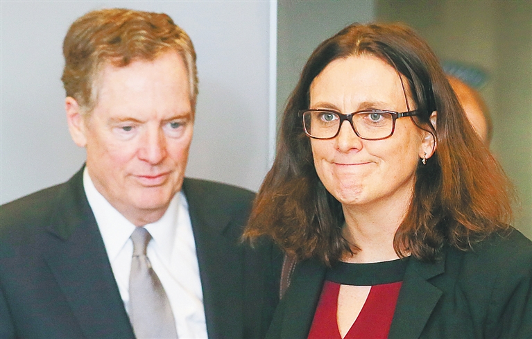 3月10日,在比利时布鲁塞尔,欧盟委员会主管贸易的委员塞西莉亚·马尔姆斯特伦(右)与美国贸易代表莱特希泽就美国钢铝产品关税政策继续谈判。 新华社/路透