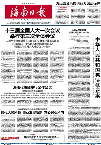 | 海南日报 头版 001 2018-03-121 2018年03月12日 星期一 |