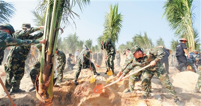 这是陵水首批退塘还林区域,此次种植的椰子树、木麻黄等具有较强的防护作用,能达到“塘退下 林还上 不反弹”的效果和美化环境作用。据统计,当天,陵水参加植树活动约1200人,共种植椰子树、芒果树等树苗约6000株。图为驻陵水边防官兵在植树。文/本报记者 李艳玫
