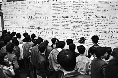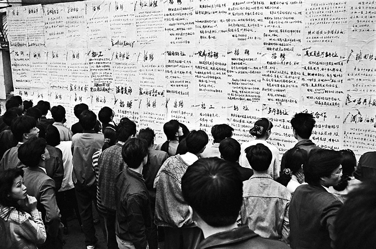 当时,在海口东湖三角池旁,有个很小的人才市场,也是“闯海人”初到海南时的必去之地。热爱拍摄的黄一鸣时常拿着相机,去拍那些年轻人在贴满招聘信息的砖墙前扎堆寻求工作时的模样。而那堵贴满了各种招聘和求职信息的墙,人们将其形象地称为“闯海墙”。