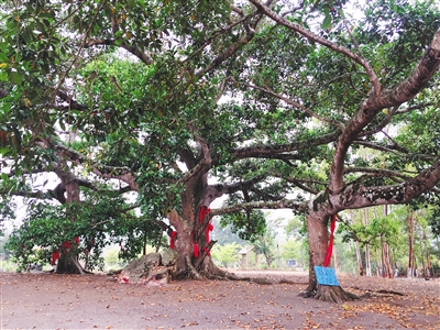 另一处标志性树景,在距离乡政府几公里以外的抱由村委会办公楼前,也是一处巨大相连的古榕,气根多如丛林,铺展开来占满了整个村委会院落。朋友说,曾有人仔细数过这些大大小小的气根,说是正好是108根。这个吉祥的数字未经考证,但能说明人们对这株古树寄寓着美好期望,希望它成为一片福地。