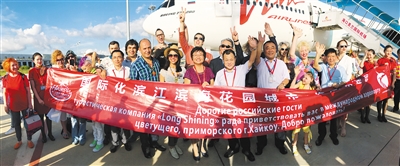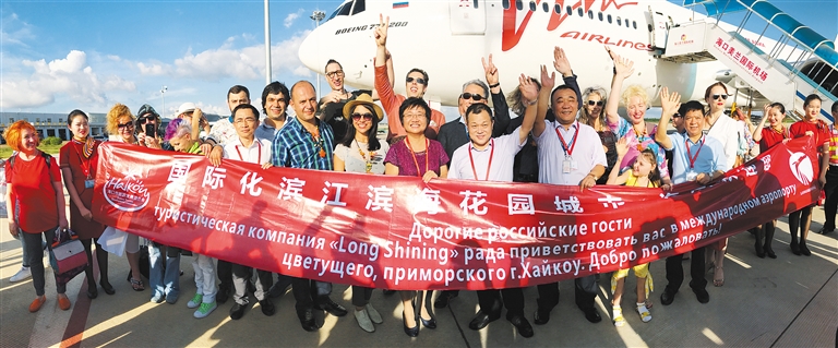 2017年7月11日,莫斯科⇌海口直飞定期航线正式开通。图为俄罗斯客人抵达海口受到热烈欢迎。本报记者 张茂 通讯员 高珏 摄
