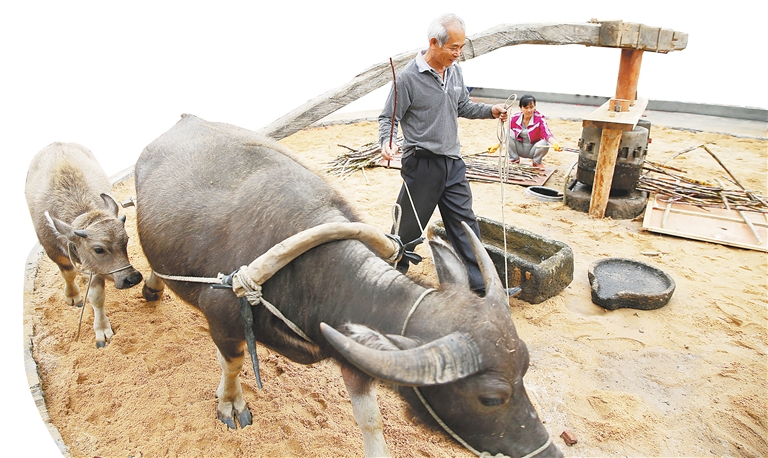 吴少玉说,家里的老人告诉她,这个“大家伙”在她爷爷那一辈的时候就有了。如今,公司引进了一些新型榨汁机,这个压榨甘蔗的工具慢慢退出了历史舞台。但两个大石碾上的凹痕和大梁上的打磨痕迹,一直在静静地讲述着土法制糖手艺人的故事。