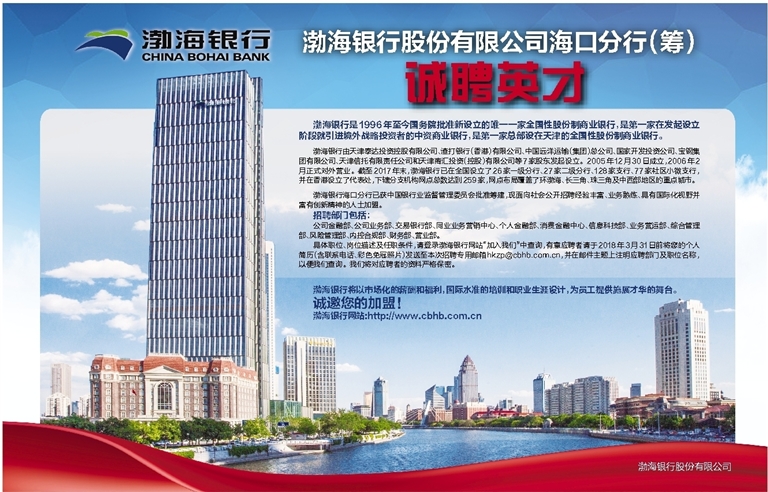 渤海银行海口分行已获中国银行业监督管理委员会批准筹建,现面向社会公开招聘经验丰富、业务熟练、具有国际化视野并富有创新精神的人士加盟。
