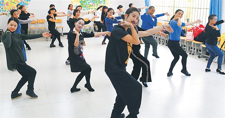3月15日,在云南禄劝彝族苗族自治县民族实验中学,北京舞蹈学院教师、文艺志愿服务者陈骏(前)为乡村教师培训舞蹈。 新华社发