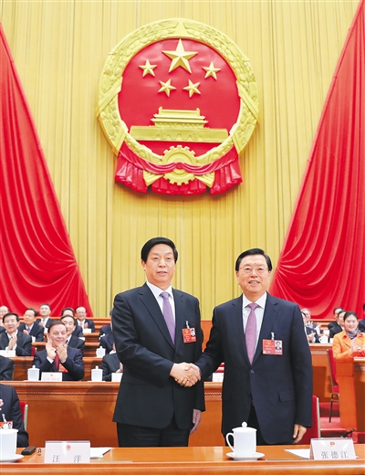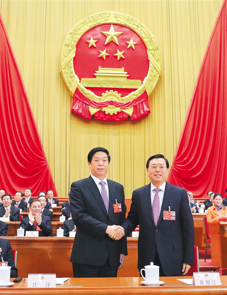 3月17日,十三届全国人大一次会议在北京人民大会堂举行第五次全体会议。栗战书当选为第十三届全国人民代表大会常务委员会委员长。这是栗战书同十二届全国人大常委会委员长张德江握手,相互致意。