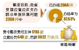 据统计,截至目前,我省受理边督边改交办群众举报环境问题2358件中,已办结2064件,办结率为87.53%,责令整改责任主体1793家,立案处罚648家,罚款3922万余元,立案侦查19件,拘留49人;约谈416人,问责296人。