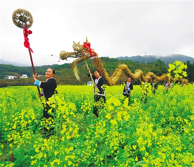 3月18日,在广西龙胜各族自治县平等镇广南村,侗族同胞在油菜花田里舞草龙,为新的一年讨个好彩头。
