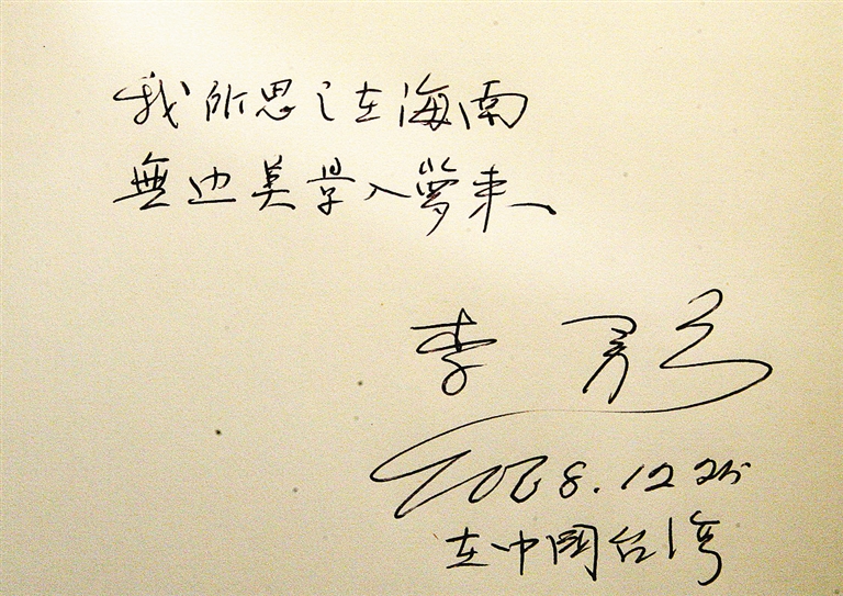 下午,李敖来到北京法源寺参观,我们跟随而至。李敖为法源寺题词:“法海真源,尽在于斯”“物我两忘,人书俱老”;法源寺赠送给李敖一尊观音像及一些文史资料。这些都是当天受到各路媒体聚焦的活动。可对于负有采访使命的我来说,最重要的一件事情也在法源寺完成了:高先生将我的信递给李敖,说海南岛有一位记者也追踪来了。李敖与高信疆先生谈起海南岛,高先生说起我此行的目的,平时伶牙俐齿的李敖,不顾凤凰卫视的有关规定,欣然提笔,在一张硬纸上写下了一行大字:我所思之在海南。我欣喜若狂!稿件当晚发回海南日报,第二天的海南日报头版显要位置刊发了这一令人振奋的新闻。后来看到央视等相关媒体的报道,我才知道,海南日报是得到李敖题词的唯一媒体。可惜,3天之后的25日,罕见的特大台风“达维”横扫海南,我们原先的报道计划只好中断,本意想借李敖对海南的期待和赞美来提升海南的知名度,借此外宣海南初衷,却被这样一场大台风给冲淡了。