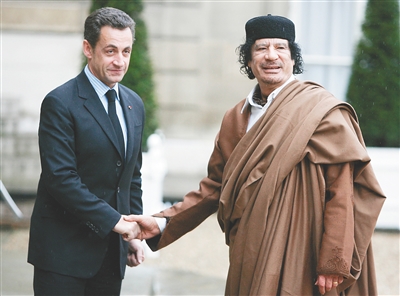 这张2007年12月10日的资料照片显示,法国时任总统萨科齐(左)在法国巴黎与利比亚时任领导人卡扎菲握手。 新华社/美联