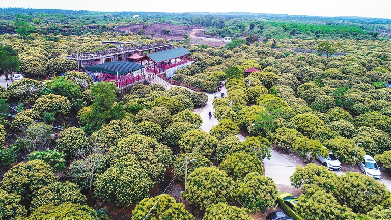 近日,在海口市永兴镇荔枝园种植基地,万亩荔枝树长势良好,已挂满金黄嫩花,春风拂过,清香满园。